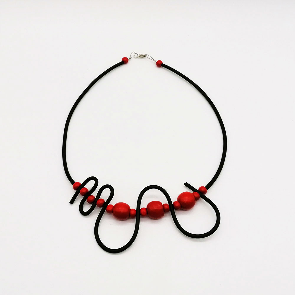 Ručno rađena asimetrična ogrlica od kaučuka i drvenih perlica. Na sajli s kopčom.