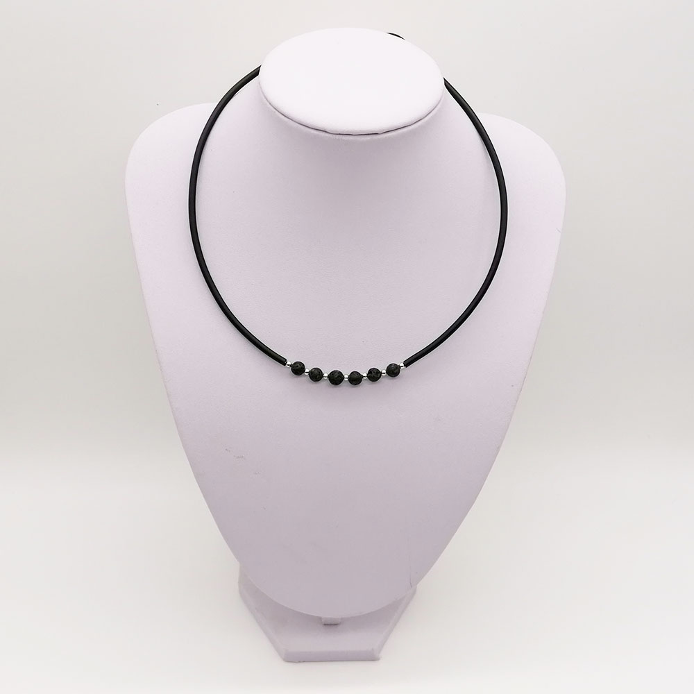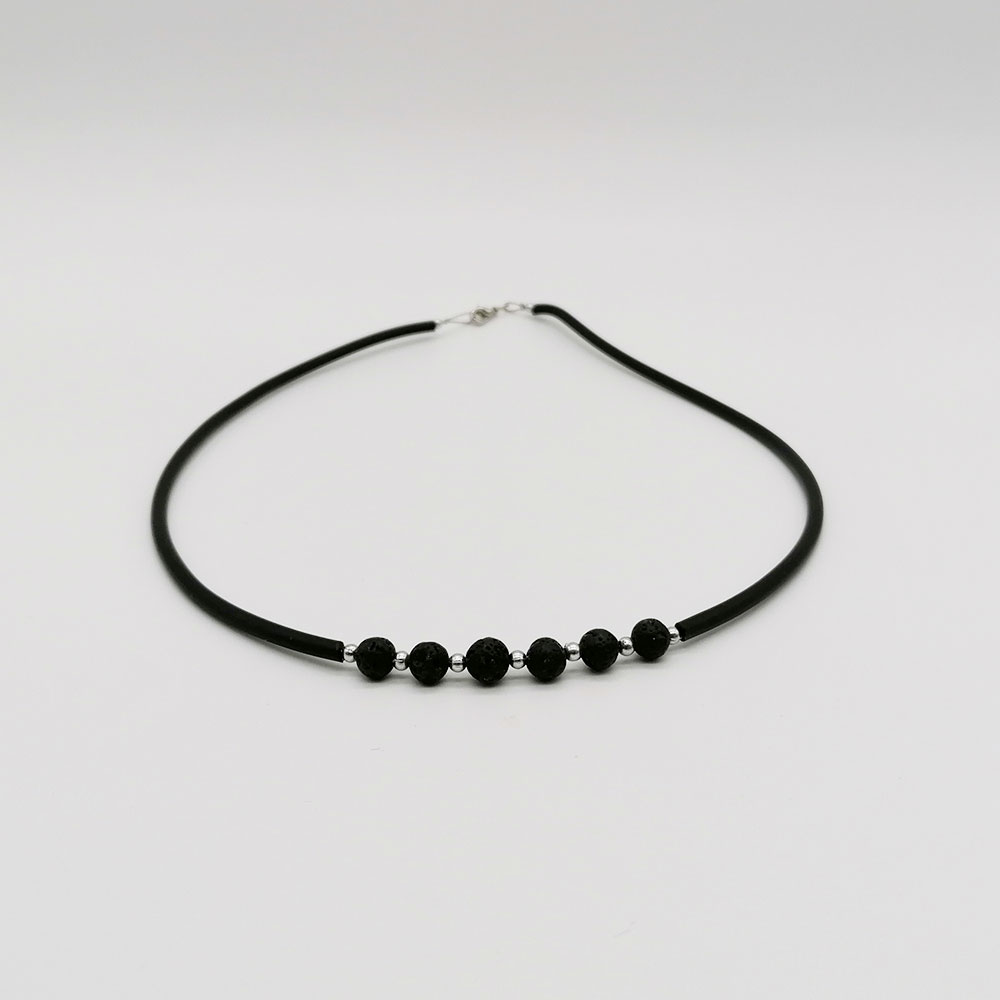 Ogrlica od kaučuka i prirodnog vulkanskog kamena. Na sajli s kopčom.